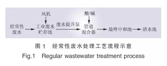 電廠工業廢水(以下簡稱工業廢水)處理系統設計出力10 m3/h。根據工業廢水的排放周期, 將其分為經常性廢水和非經常性廢水。經常性廢水主要包括水處理除鹽設備再生排水、過濾器沖洗排水、反滲透排水、凝結水精處理裝置再生排水等; 非經常性廢水主要包括空氣預熱器清洗廢水、除塵器沖洗水、鍋爐化學清洗廢水、主廠房地面沖洗水等。對于經常性的廢水, 處理方式為:經各自的收集系統收集至廢水集中處理站廢水貯存池內, 用泵及壓縮空氣進行攪拌、曝氣, 混合均勻后用泵送至最終中和池, 調整pH值后流入清水池, 工藝流程如圖1所示。