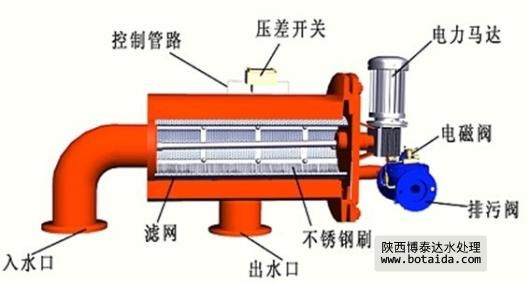 待處理的水由入水口進入機體,水中的雜質沉積在不銹鋼濾網上,由此產生壓差。通過壓差開關監測進出水口壓差變化,當壓差達到設定值時,電控器給水力控制閥、驅動電機信號,引發下列動作:電動機帶動刷子旋轉,對濾芯進行清洗,同時控制閥打開進行排污,整個清洗過程只需持續數十秒鐘,當清洗結束時,關閉控制閥,電機停止轉動,系統恢復至其初始狀態,開始進入下一個過濾工序。