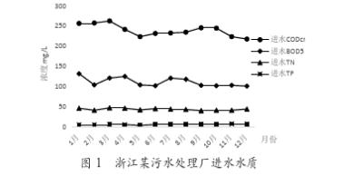 圖1是浙江某污水處理廠的2017年進(jìn)水水質(zhì)。通過(guò)分析,全年進(jìn)水COD平均值為240 mg/L,進(jìn)水BOD為111 mg/L,進(jìn)水總氮為43 mg/L,總磷為5.78 mg/L。來(lái)水中BOD/COD=0.46/0.45,通過(guò)可生化性分析,該進(jìn)水屬于易生化廢水。碳氮比分析中,BOD/TN=2.58;而在日常分析中,碳氮比低至2.0~2.1;相關(guān)研究表明,碳氮比在4~5時(shí),才能有較好的脫氮除磷效果。通過(guò)以上分析,本廠的進(jìn)水雖然易生化,但是碳氮比較低,特別是在進(jìn)水碳源較低的情況下,低碳源對(duì)于出水穩(wěn)定達(dá)標(biāo)造成一定的風(fēng)險(xiǎn),因此需要外加碳源作為進(jìn)水碳源的補(bǔ)充。