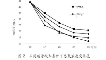 如圖2表示,葡萄糖作為外加碳源,在投加量分別為0、20mg/L、40mg/L和80mg/L情況下,總氮隨時(shí)間的變化值??偟S反應(yīng)時(shí)間的延長(zhǎng),濃度逐漸降低,最終出水濃度分別為21mg/L、18mg/L、15mg/L和12mg/L。在投加碳源后,系統(tǒng)對(duì)脫氮的效果有所提升,對(duì)總氮的去除率分別為52%、59%、66%和73%。投加碳源達(dá)到20mg/L后出水滿足《城鎮(zhèn)污水處理廠污染物排放標(biāo)準(zhǔn)》GB18918-2002中的一級(jí)B標(biāo)準(zhǔn),而且隨著投加量的增加,系統(tǒng)對(duì)總氮的處理效果增強(qiáng)。實(shí)驗(yàn)表明:碳源的投加,保證了硝化細(xì)菌,特別是異養(yǎng)型反硝化細(xì)菌對(duì)碳源的需求,提高的脫氮的效果。