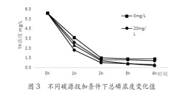 如圖3表示,葡萄糖作為外加碳源,在投加量分別為0、20mg/L、40mg/L和80mg/L情況下,總磷隨時(shí)間的變化值。總磷隨反應(yīng)時(shí)間的延長(zhǎng),濃度逐漸降低,最終出水濃度分別為1.2mg/L、1.0mg/L、0.6mg/L和0.5mg/L。在投加碳源后,系統(tǒng)對(duì)除磷的效果有所提升,對(duì)總磷的去除率分別為80%、83%、90%和92%。投加碳源達(dá)到20mg/L后,出水均滿足一級(jí)B標(biāo)準(zhǔn),而且隨著投加量的增加,系統(tǒng)對(duì)總磷的處理效果增強(qiáng)。