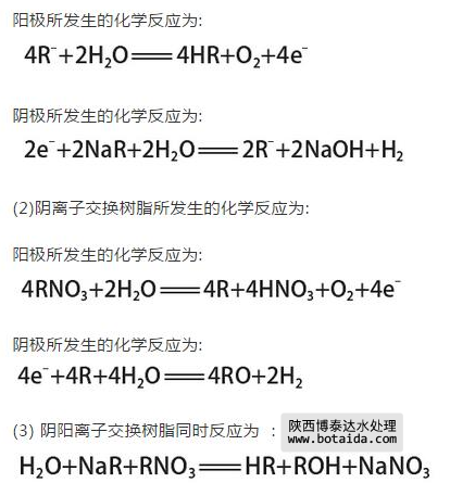 在利用滲析的極化過程中,由于在水溶液中會產(chǎn)生H+和OH-,使樹脂在化學反應中進行電化學再生,這對水質(zhì)的提升具有正面的影響,而在再生的過程中,如果不進行離子交換處理,就會造成水質(zhì)變壞,這樣就需要采用適宜的工作環(huán)境,才能達到提高水質(zhì)的要求,采用EDI裝置的離子交換樹脂技術(shù),可以有效的提高水質(zhì)。具體的化學反應方程式如下,