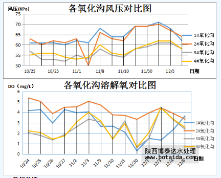 旋流曝氣器會卷吸起底部的泥水混合物,旋流曝氣器會將藏在底部污泥中的部分有機物進一步消化分解,故在運行初期,旋流曝氣器產生的一部分溶解氧用來消解底部的污泥。故在運行初期,安裝旋流曝氣器的3#、4#氧化溝溶解氧不高。隨著旋流曝氣器的穩定運行,池底堆積的污泥進一步消解,氧化溝中額溶解氧進一步上升。博泰達預測,在未來數月內,3#、4#氧化溝內的溶解氧會繼續上升,直至底部污泥消解殆盡。