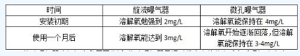 在溶解氧方面,在改造項目的使用初期,微孔曝氣器氧溶解氧更高,旋流曝氣器的溶解氧會隨著時間的延伸而升高直至穩定。