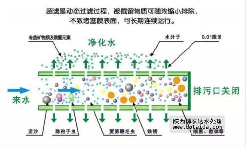 自來水從濾芯端面進入到超濾膜內后,在正常水壓的作用下,凈水從超濾膜管壁滲出,而泥沙、鐵銹、膠體、細菌、懸浮物、大分子有機物等有害物質被截留在超濾膜管內,并在用戶使用直通自來水或對濾芯進行沖洗和反沖洗時從直通自來水出口排出。