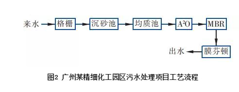 廣州某精細化工園區污水處理項目于2006年4月建成投產,該項目污水排入珠江,執行廣東省地方標準《水污染物排放限值》(DB 44/26-2001)第二時段一級標準以及《城鎮污水處理廠污染物排放標準》(GB 18918-2002)一級A標準的較嚴值,要求COD≤40 mg/L、 TP≤0.5 mg/L。廢水來源主要包括化工廢水、潤滑油廢水等,含有煙酰胺、醫藥中間體、潤滑油、樹脂等污染成分。其中,精細化工廢水占主要部分,僅有極少量的生活污水。污水成分復雜,可生化性差,處理難度大。原處理工藝包括格柵、沉砂池、調節池、水解酸化池、生化池、膜生物反應器(MBR)等(見圖2)。因水廠COD、TP波動較大,為了保證出水穩定達標,并同時增加高濃度廢水的處理量以提高經濟效益,新增膜芬頓作為深度處理單元。該設施于2018年10月正式投產,處理規模為2 000 m3/d,穩定運行至今。