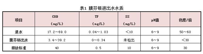 膜組件聚偏氟乙烯(PVDF)中空纖維膜,膜過濾孔徑約為0.04 µm,可截留懸浮物、大分子膠體物質及細菌。運行數據表明,出水TSS可保持在檢測限以下。