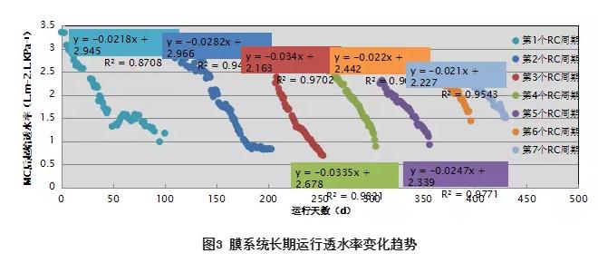 ① 透水率穩定性透水率(J25/△P)是衡量膜滲透性能的主要指標。以透水率隨運行時間的衰減速率作為膜系統運行穩定性的評價指標,方法是:通過線性擬合分析得到每次維護性清洗(MC)后的起始透水率,再將每個恢復性清洗(RC)周期內的起始透水率進行線性回歸得到每個RC周期內的透水率衰減速率,見圖3。