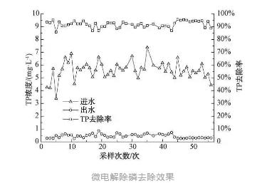 微電解除磷去除效果如下圖所示, 進(jìn)水 TP 濃度為3.5~7 mg/L,平均濃度為5.64 mg/L。當(dāng)進(jìn)水TP濃度為3.5~5 mg/L時(shí),出水TP濃度穩(wěn)定于0.5 mg/L以下,達(dá)到一級A標(biāo)準(zhǔn);當(dāng)進(jìn)水TP濃度在5~7 mg/L時(shí),出水TP濃度穩(wěn)定小于1 mg/L,達(dá)一級B標(biāo)準(zhǔn);平均去除率為91.84%~95%。項(xiàng)目試驗(yàn)結(jié)果表明,微電解除磷-砂濾技術(shù)可有穩(wěn)定高效的除磷效果,出水TP穩(wěn)定達(dá)標(biāo)。