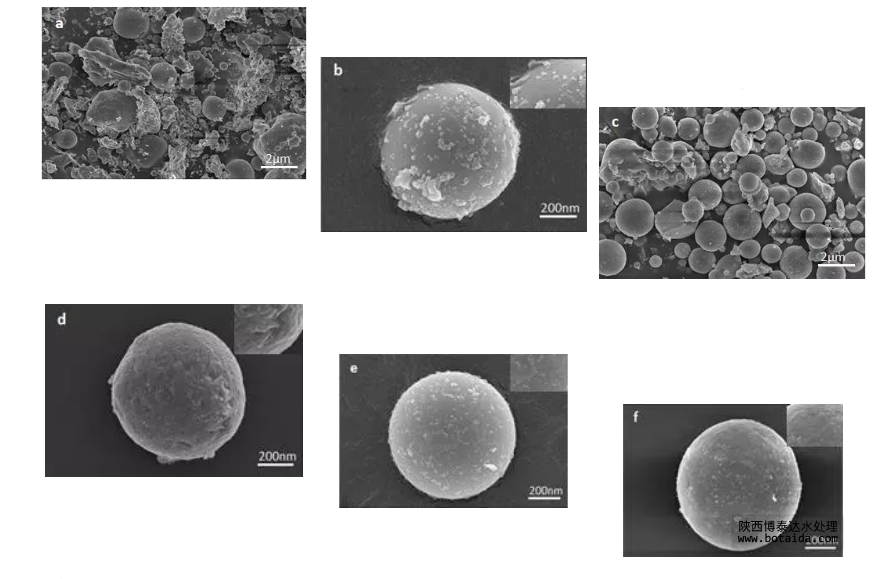 如圖所示,為原始粉煤灰和改性粉煤灰的SEM圖。(a)圖和(b)圖為原始粉煤灰的掃描電鏡圖,可以看出原始粉煤灰為規則的球形結構,其大小和粒徑呈不均勻分布狀態,且其表面比較均勻光滑,粘附大量無機鹽顆粒,使其吸附位點很少暴露在外面,大大降低其吸附性能。(c)圖和(d)圖為HCl改性粉煤灰的SEM圖,通過與(a),(b)圖對比可以看出,經過HCl腐蝕清洗預處理的粉煤灰的表面粗糙度大大增加,其表面形成大量凹槽和孔洞,這是由于HCl的溶解鹽類和腐蝕作用形成的。在改性的過程中HCl溶解粘附在粉煤灰表面鹽類和有機物的同時腐蝕粉煤灰的玻璃體結構。