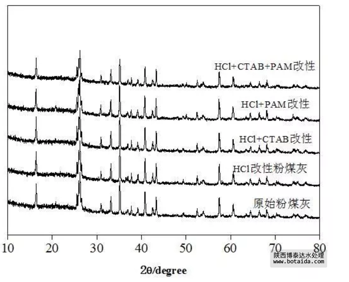 上圖為原始粉煤灰及改性粉煤灰的XRD譜圖。由圖可知,原始粉煤灰的X射線衍射譜圖與經過改性的粉煤灰的X射線衍射譜圖相比,特征峰位置基本不變,這與粉煤灰是在高溫下形成的有很大關系,其在高溫下形成玻璃體結構和組成成分很難改變。SiO2的特征衍射峰在26°附近,Al2O3的特征衍射峰在43°附近,Ca(OH)2的特征衍射峰在32°附近,峰面積與其含量有關,含量越高,峰面積越大。由圖可知,SiO2的特征峰基本不變,說明粉煤灰的基本玻璃體結構大部分未被破壞。Al2O3和Ca(OH)2的特征衍射峰值略微減少,說明HCl改性使其溶出,增大了粉煤灰的表面粗糙度,增加了吸附位點,這與SEM圖表征結果一致。粉煤灰中玻璃體的含量可以由XRD圖譜上有許多分散的細小峰包的峰面積和峰范圍大小相對表示,由圖可得,粉煤灰的衍射強度降低,改性粉煤灰的峰包面積小于原始粉煤灰,說明改性過后的玻璃體結構部分被破壞。
