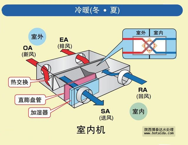 主要部分就是全熱交換機(機內(nèi)有過濾裝置),作用就是將室外空氣吸入經(jīng)過過濾和要排出的空氣進行熱量交換,使得新風(fēng)口出來的空氣與室內(nèi)溫度溫差不大,從而達到舒適度和能耗上良好的效果。